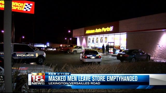 Police say two men walked into Advance Auto Parts on Versailles Road with shirts wrapped around their faces around 8:45 p.m. An employee says the men didn’t notice him and went to the back of the store, so he ran outside and called 911. Nobody saw the suspects again, and police say they didn’t take anything.