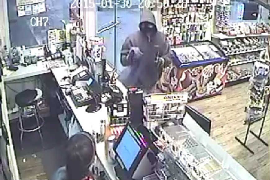 The robber is described as a white man between 6′ and 6’3, about 175-195 lbs, blue or hazel eyes and brown/auburn hair. During the robbery, he had facial hair that protruded from his ski-mask.