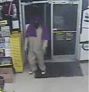 They say he was wearing a black mask, a purple towel, gray gloves, a gray long sleeve T-shirt under a matching tan top/bottom that resembles “scrubs” or some type of uniform that had large plastic buttons on the top.