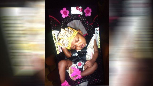 She was wearing a white sleeveless onesie with a pink giraffe on the front, pink sandals and a hat that matches her outfit. The car she was in was not stolen.